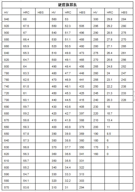 除去洛氏硬度HRC,還有維氏硬度HV,布氏硬度HB,不同的材質(zhì)所用的硬度檢測(cè)表示方法不同,它們之間可以換算。換算表如下,可以參考下:
